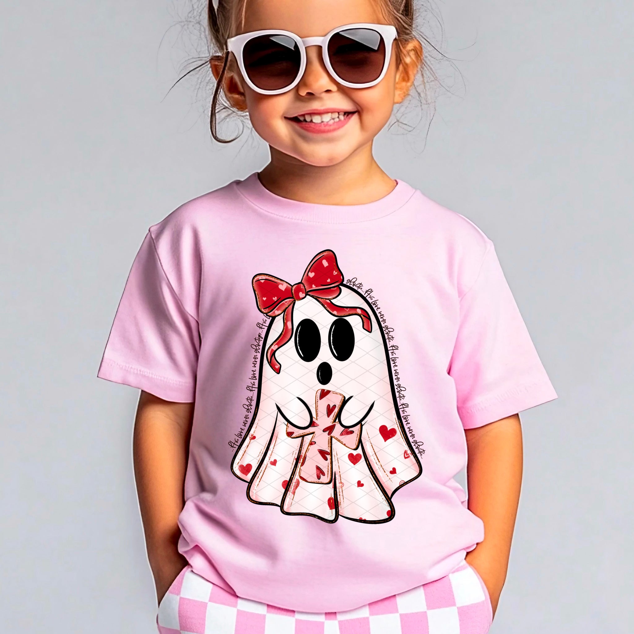 • Load image into Gallery viewer, His Love Never Ghosts Red Bow And Cross With Hearts With SLEEVE OPTION TRANSFER SDD DEC 25